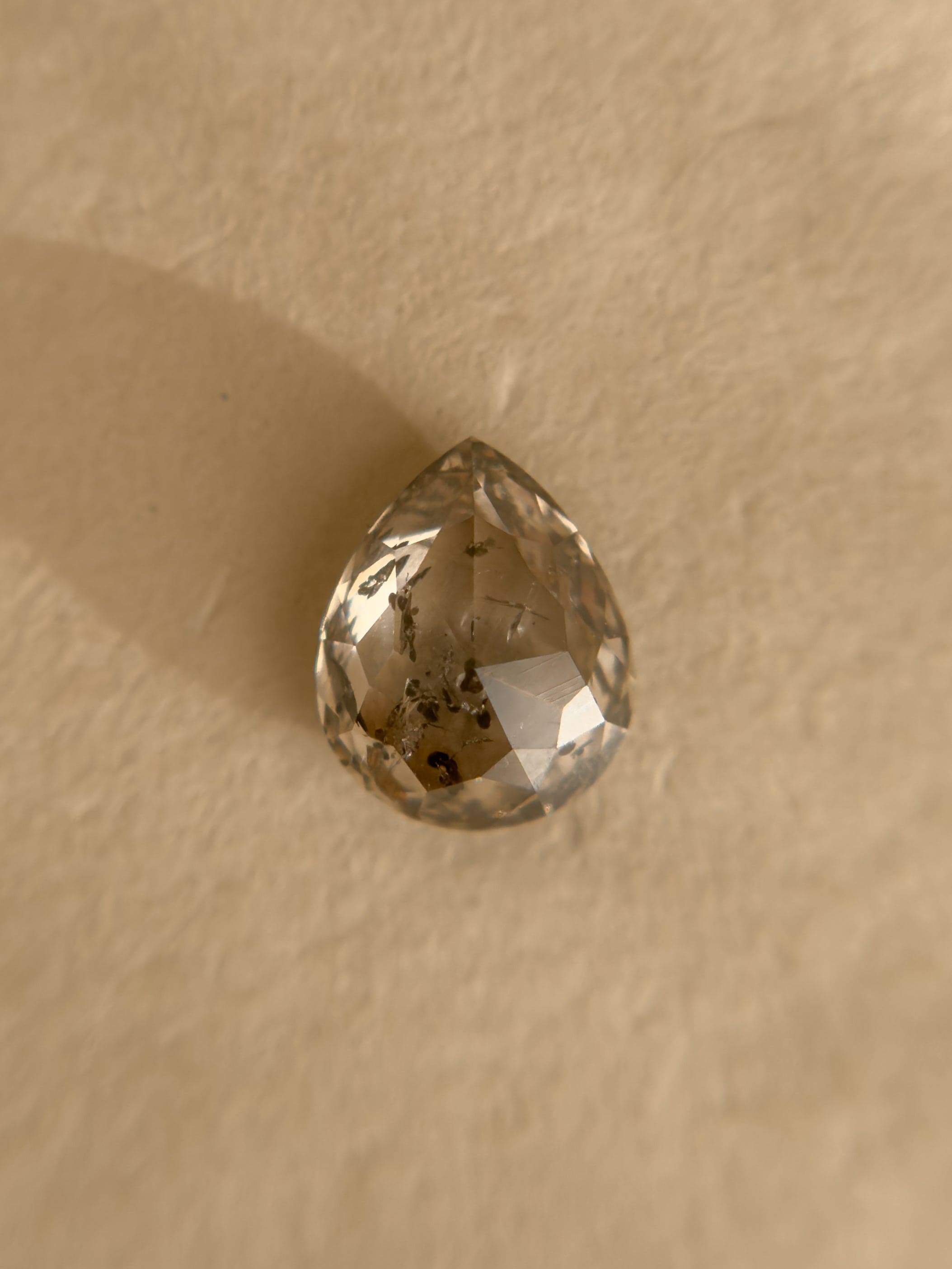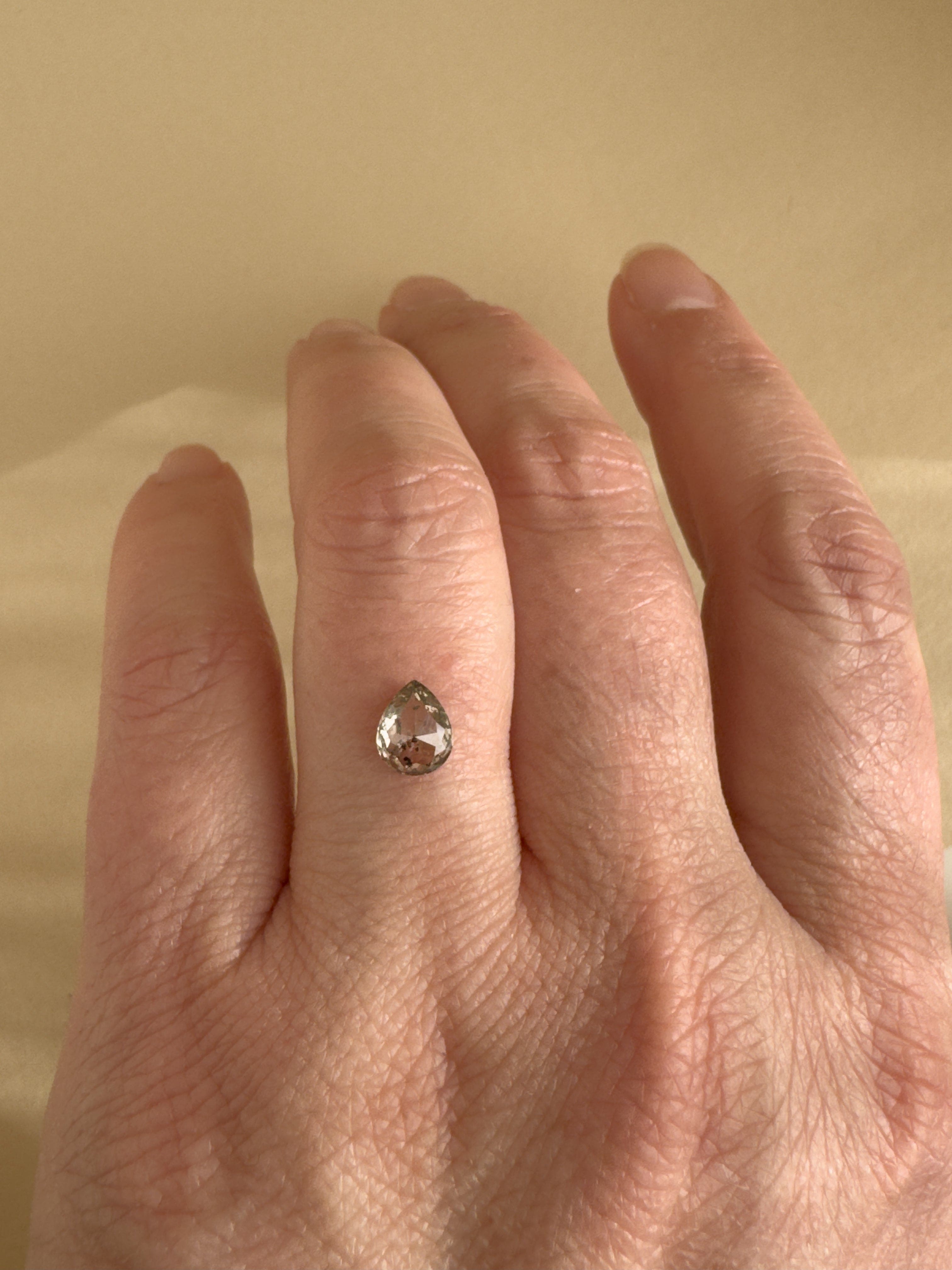 Night Garden is a stone of shadow and glow — inspired by gardens that come alive after dusk. This rose-cut pear diamond holds a soft champagne warmth, scattered with salt-and-pepper inclusions that feel like constellations drifting through twilight.
