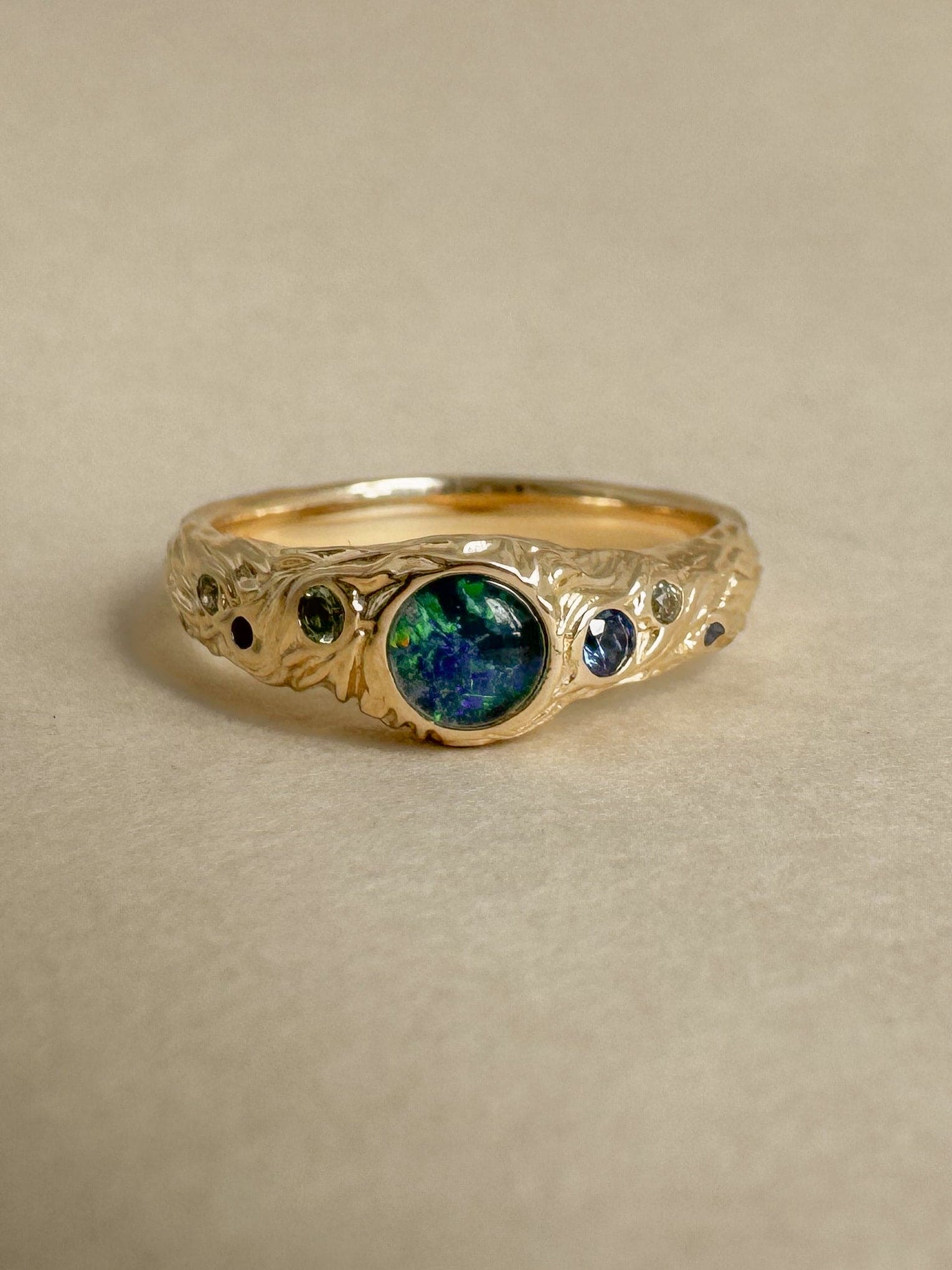 14K Yellow Gold, Opal, Sapphires.