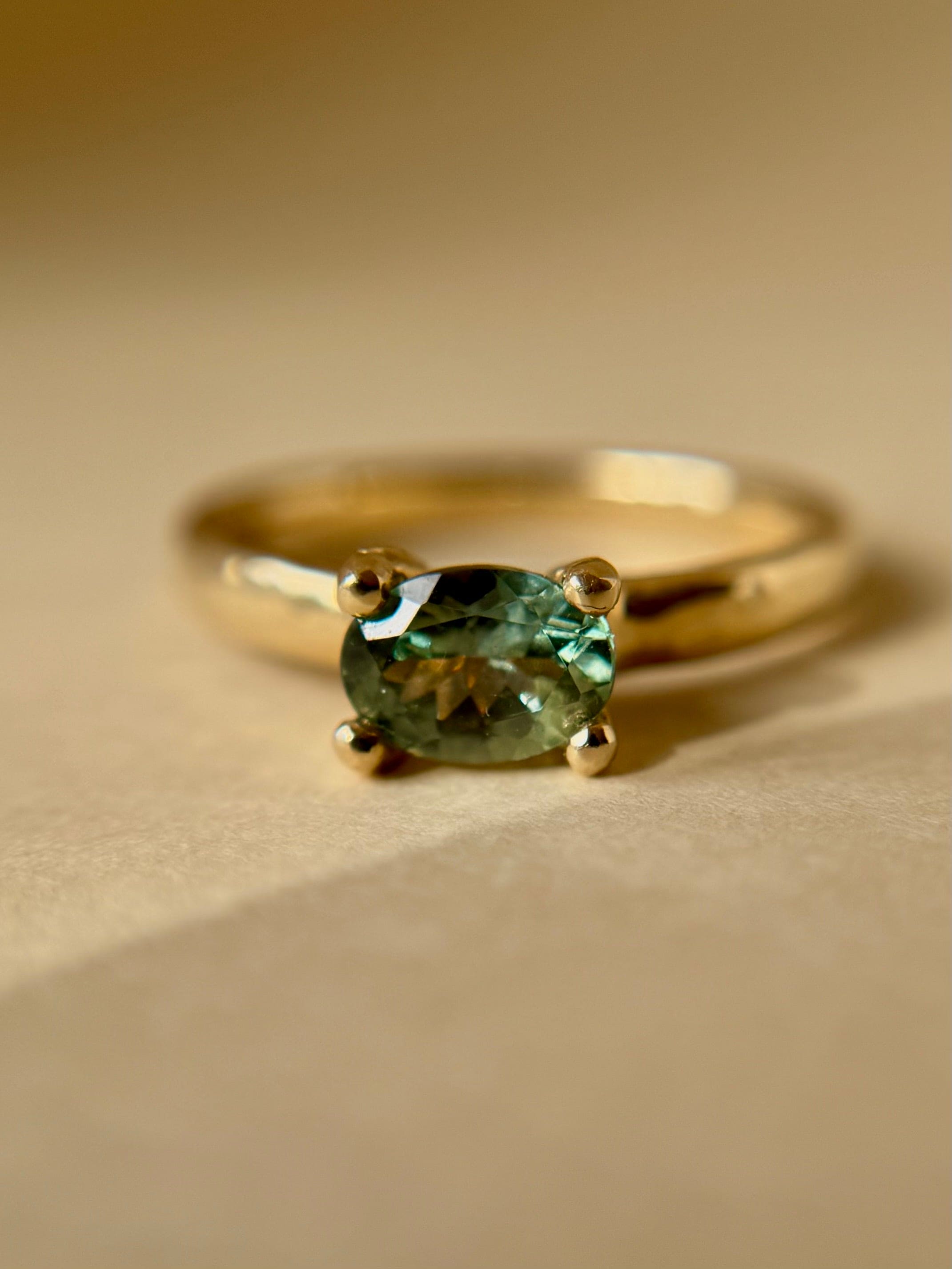 This green-blue oval Montana Sapphire, a symbol of eternal beauty, sits nestled in a strong prong setting that evokes the gracefulness and strength. Its band is textured with our signature reflections of love captures the essence of water’s untamed spirit, while the diamond's brilliance reflects the radiant warmth of the sun.