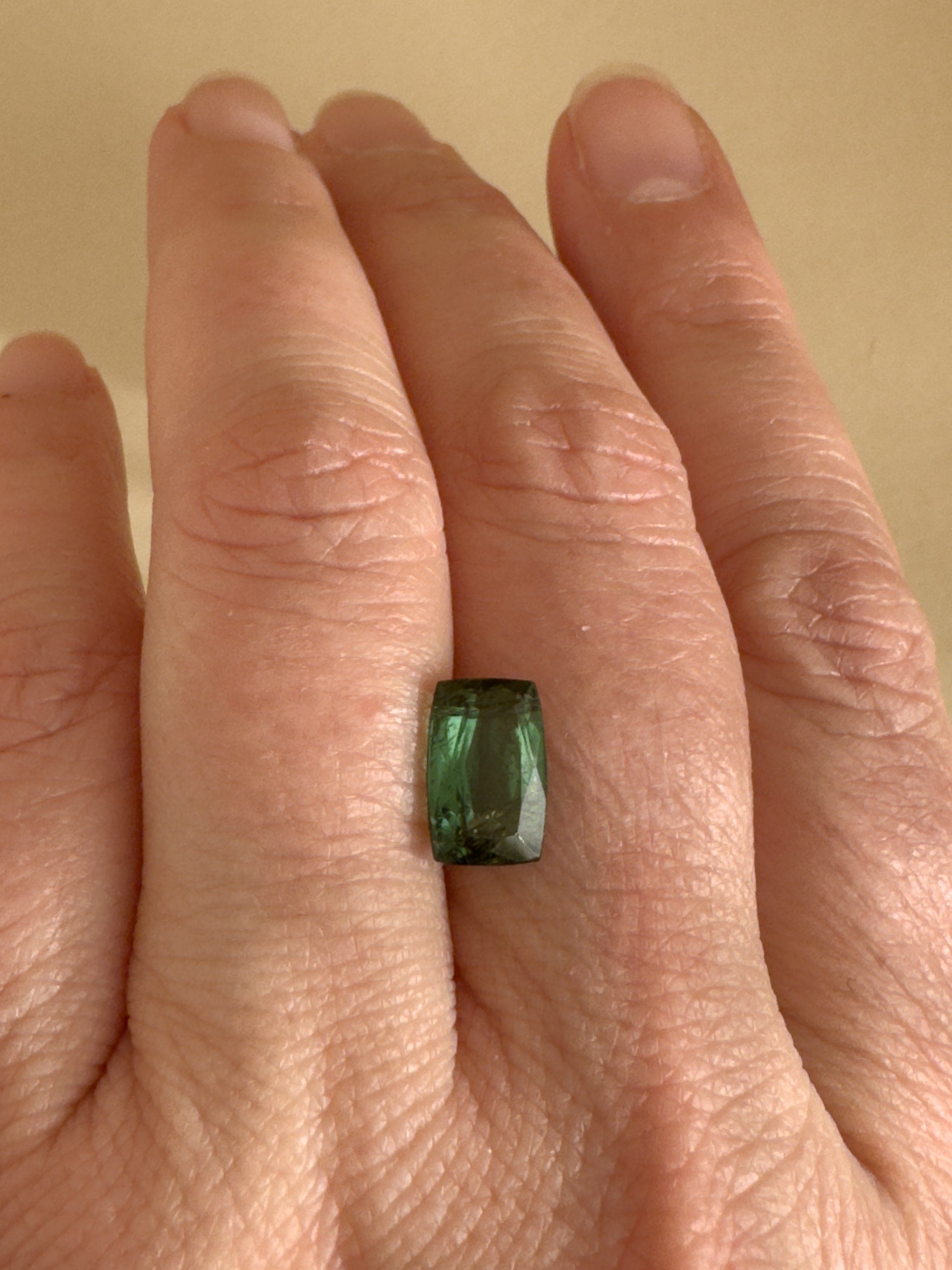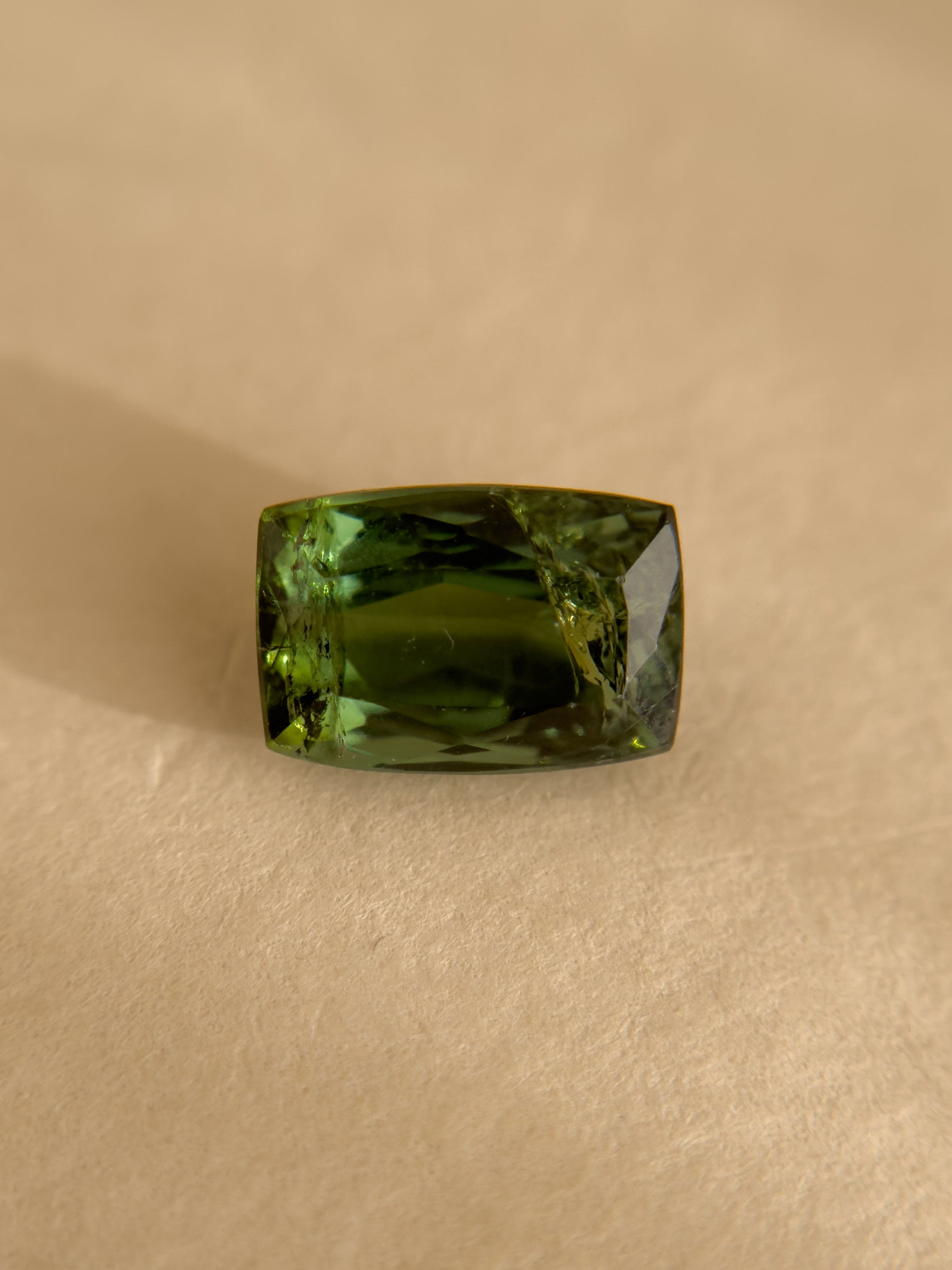 Deep Fern is a natural green tourmaline chosen for its rich, living color — the kind of green found in shaded forest floors where ferns grow thick and slow. Its cushion cut softens the stone’s edges, giving it an organic, almost tactile presence.